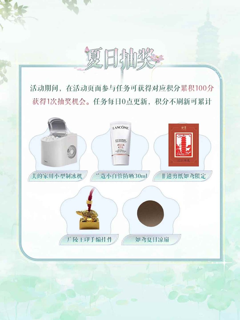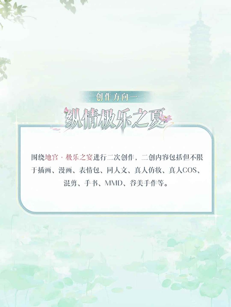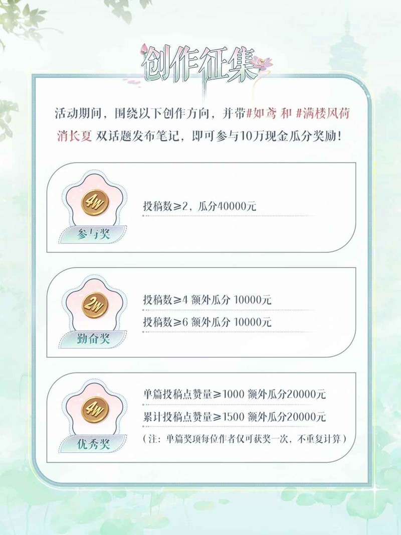 参与方式:围绕 “纵情极乐之夏”、“江海捞捞无尽夏”、“长风万里玩一夏”三大创作方向,并带 #如鸢 和 #满楼风荷消长夏 双话题发布,即可参与活动。