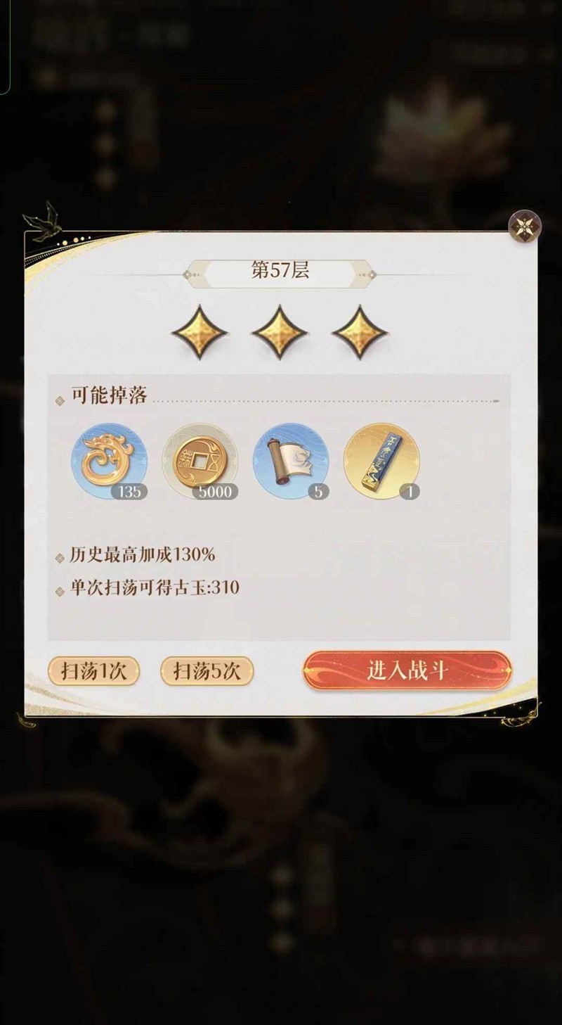 全程没买次数,每天用掉免费次数,直接最后一天用白金币买阴文。第一天就抽了新密探加成,最高扫荡310。遗迹全通。古玉全期刷满是166223。