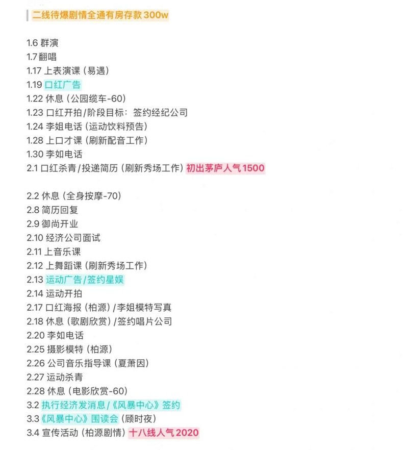按照我这个日程走,数值一直是足够的。图中没有详细标,但我说明一下在接取《旧时光》前,你已经够存款买一套房了(感谢不停刷百万红包的我!),全属性点+200,我选了518这个好日子乔迁新居,这之后你的四项数值:人气早早溢出,歌艺、表达、体能一般还缺点,那你就去上对应的课程(音乐、口才、舞蹈)各一次,再加上其他时间疯狂打工,我在5.29就提前数值达标,5.31准时去接通告。怎么赶上《花间月》剧情,就是前面接的通告《风暴中心》、琅西品牌挚友接完之后就尽早完成,然后有周几限制的通告,基本每周做满就差不多了,系统给的通告杀青才能进行下面剧情,《花间月》剧情只要你进度正常,都是5月20日开始。