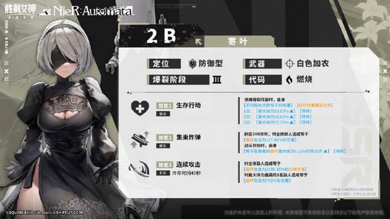 2B拥有根据最终最大体力等比例增加攻击力的特性。每当使用爆裂技能,她的最大生命值就会增加,可以进一步提升攻击力。