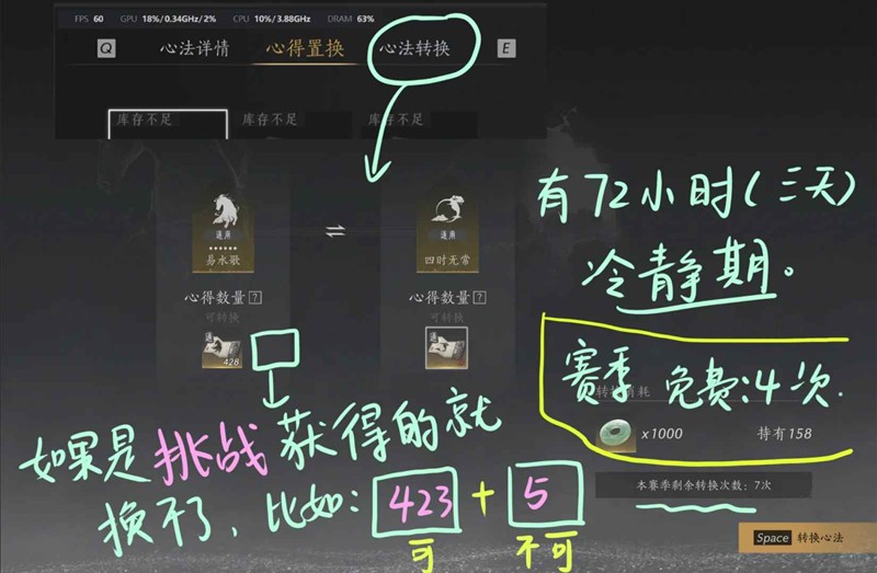 解释:两个同样属性的心法互换,比如金色通用和金色通用,紫色流派和紫色流派,有72个小时,也就是三天的冷静期。每个赛季有四次免费的次数,超过了四次,需要使用1000长明玉。