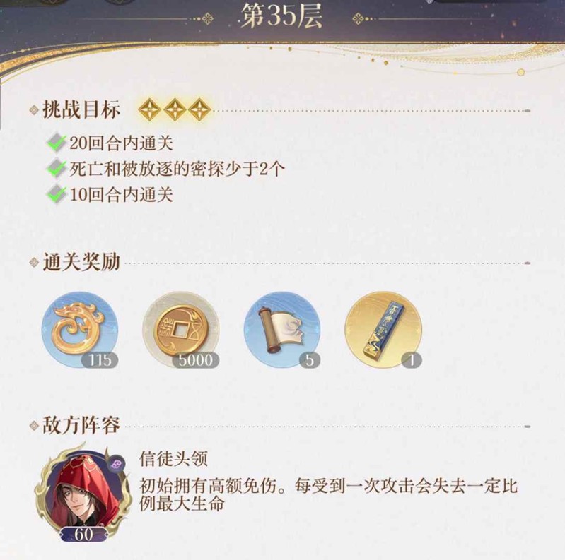大厦将倾,天下动荡,隐于暗处的野心蠢蠢欲动。你是女扮男装的广陵王,亦是掌管情报组织的绣衣校尉。你在黑暗中为天子执行机密任务,却在某次意外陷入了一个足以颠覆天下的阴谋。那么游戏中地宫35如何满星过关呢?小编为你准备了一份攻略,一起来看看吧~
