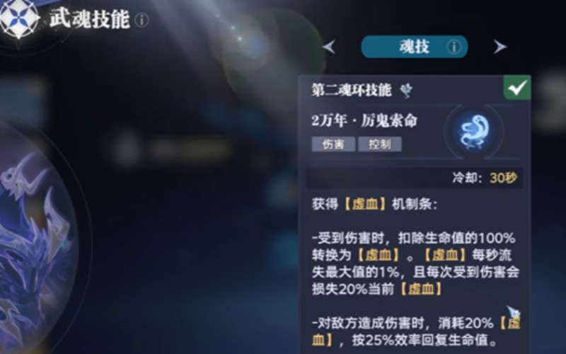 鬼魅的技能组合非常实用。普通攻击时会化身为魅影进行闪避,手感流畅。核心技能具备回魂和回血效果,分为主动和被动两种状态。被动状态下受到攻击后会持续储存虚血,攻击敌人时能按比例回血。主动技能则能造成高额伤害并附带回血效果,伤害越高回血量越大。