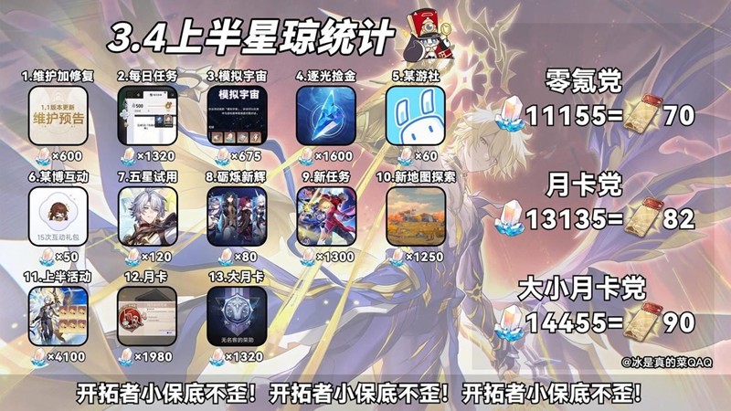 在崩坏星穹铁道3.4上半版本中,零氪的开拓者可以通过完成日常任务、活动挑战等方式获得70次抽卡所需的星琼,相当于11155星琼。对于小月卡开拓者来说,他们能够获得的星琼数量会更多,最高可达到82次抽卡所需的星琼。而大小月卡开拓者则更为丰厚,最高可以获得90次抽卡所需的星琼。这些星琼的获取主要来源于版本内丰富的活动奖励、任务达成的回馈以及月卡福利的叠加。