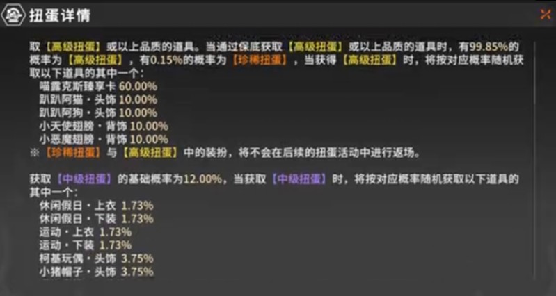 珍稀扭蛋的获取概率为0.15%,虽然几率较低但能获得限定装备,这些限定装扮往往不会返场,错过就可能永远失去获取机会。高级扭蛋的获取概率高达99.85%,可以获得头饰、季卡、背部装饰等常规装扮奖励。