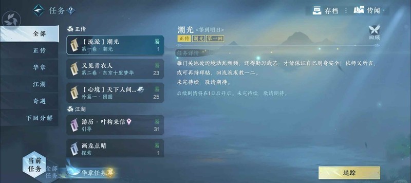 把剧情过到“去神侯府找无情”后面会提示你剧情要第二日开启,这时候去做流派任务,看见有流派两个字就点追踪!这任务就一分钟的剧情,现在你有32级了!