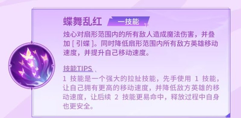 其1技能“蝶舞乱红”,可对扇形范围内的敌人造成魔法伤害,并叠加“引蝶”,同时降低敌方英雄的移动速度,自身移动速度则会提高,伤害可观且具备一定的控制效果。