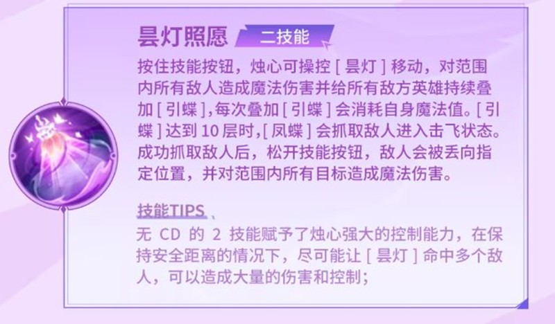 2技能“昙灯照愿”是烛心的核心技能,按住技能按钮可操控“昙灯”移动,对范围内敌方目标造成魔法伤害并持续添加“引蝶”,每次叠加“引蝶”需消耗魔法值,当“引蝶”达到10层时,“凤蝶”会抓取敌人进入击飞状态。