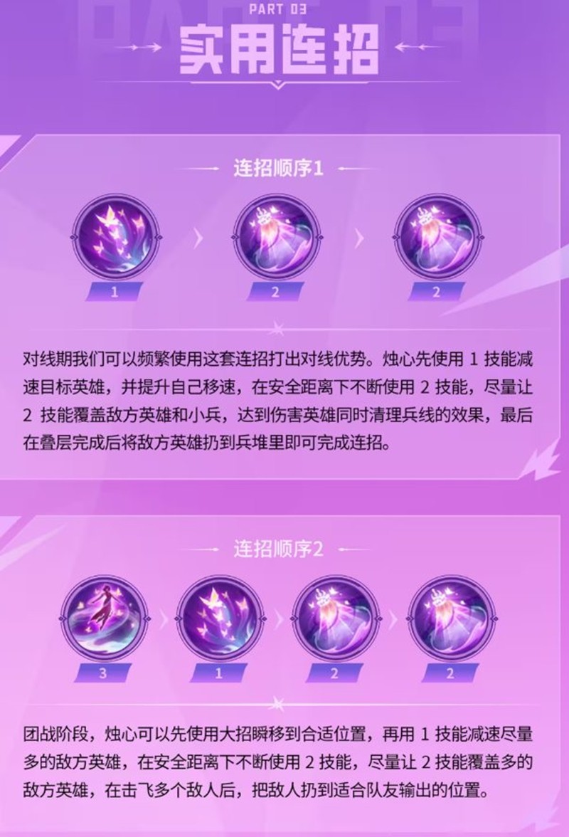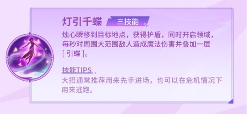 3技能“灯引千蝶”使烛心能瞬移到目标地点,获得护盾并开启领域,每秒对周围大范围敌人造成魔法损伤,并叠加一层“引蝶”,可用于刺杀脆皮或逃脱。