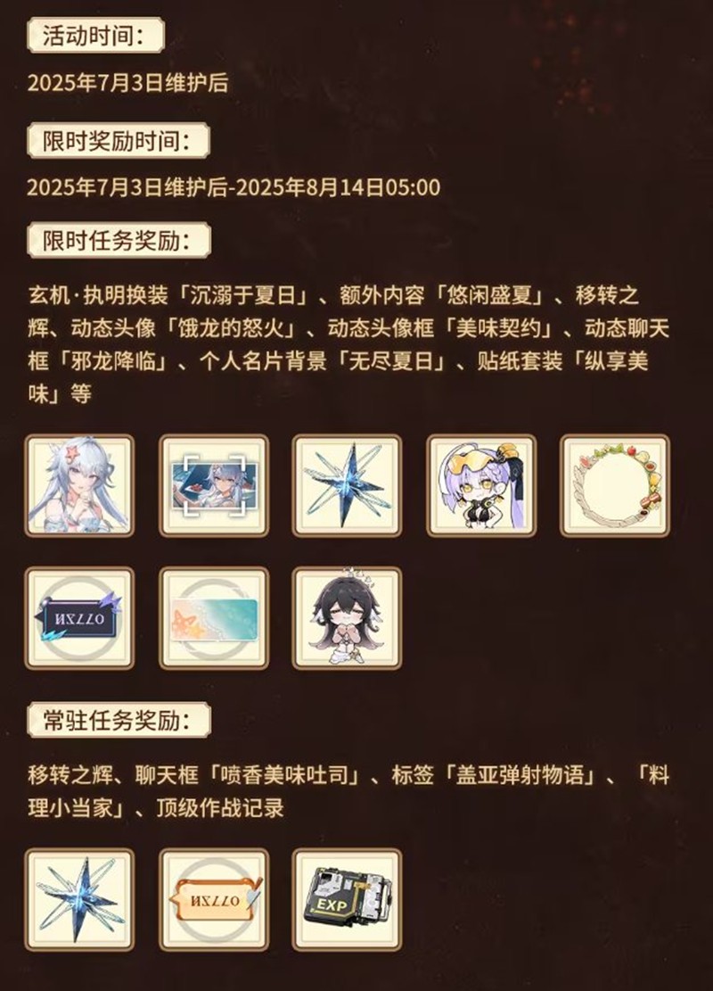 活动将于7月3日维护更新完成后正式开启,持续至7月31日,整个7月都可以尽情参与,享受夏日团建的乐趣。
