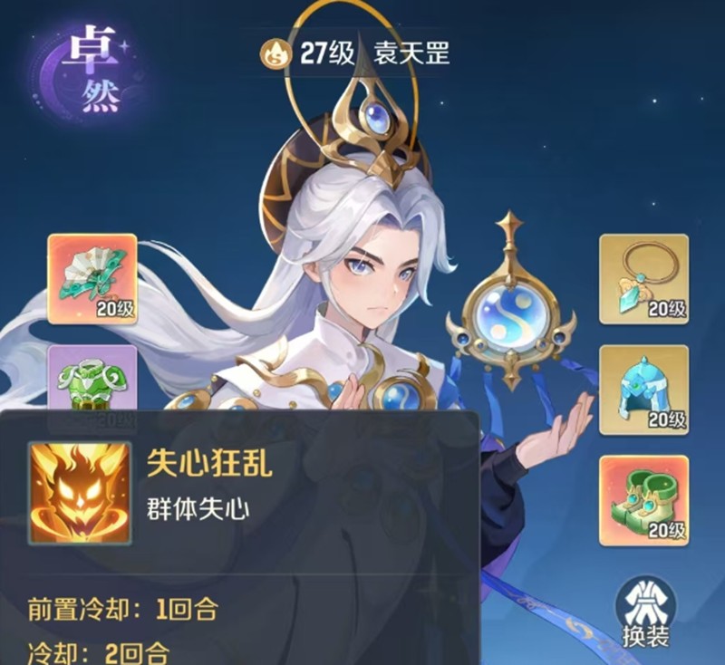 袁天罡的核心控制技能需要1回合前置冷却,使用后有2回合冷却时间。该技能能对3个单位造成范围性法术伤害,并有60%概率使目标陷入持续2回合的失心状态。需要注意的是,对非主目标的控制概率会有所衰减。
