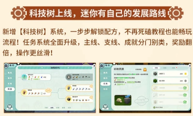 迷你世界对任务系统进行了大幅优化,将任务细分为主线、支线和成就三大类。新版任务系统不仅界面更加直观,完成任务后获得的奖励也更加丰厚。玩家可以更有目标性地推进游戏进度,体验更加流畅的游戏节奏。