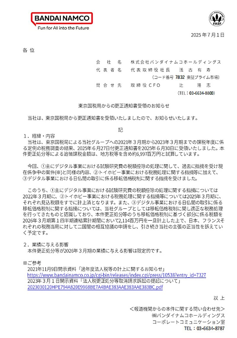 根据官方披露的信息,这次税务问题主要集中在三个方面。首先是数字业务研发费用的税务抵扣处理存在争议,其次是玩具模型业务的交易处理方式遭到质疑,最后是与法国关联公司的跨境交易也存在税务问题。虽然金额不小,但万代南梦宫表示这次补税不会对公司2026年3月期的财报造成重大影响。
