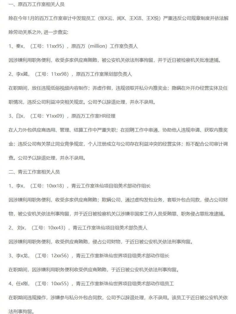 其中,原百万工作室负责人秦某因收受多家供应商贿赂被刑事拘留并批准逮捕;策划部负责人李某葳因私分内推奖金、放任低俗内容制作、隐瞒外部任职被辞退永不录用;HR经理白某因招聘串通、违规结算人力外包、注册同业公司也被辞退永不录用。青云工作室的美术动作组长李某因虚构外包业务套取合同款,涉嫌受贿罪、职务侵占罪被批捕;美术部负责人刘某、新诛仙项目动作组长李某龙因收受贿赂被刑拘;美术组员工任某刚因私分外包款被辞退永不录用并刑拘。此外,硬核工作室的美术动作组长王某离职后因受贿被追责刑拘。