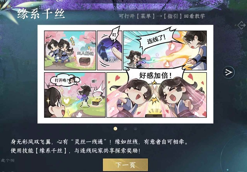 这个技能是双人探索技能,一定要找个小伙伴一起使用,和情缘、亲友一起探索,还能增加彼此的好感度哦 。