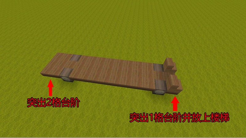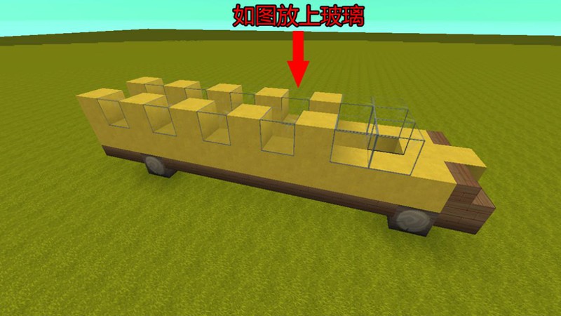 完成基础框架后,需要在台阶上方放置黄色硬沙块作为车身的主体部分。然后在2格高的硬沙块上每隔1格放置玻璃,这样就能做出校车的车窗效果。接下来继续在顶部添加果木楼梯、白杨木楼梯和黄色硬沙块,完善车顶结构。