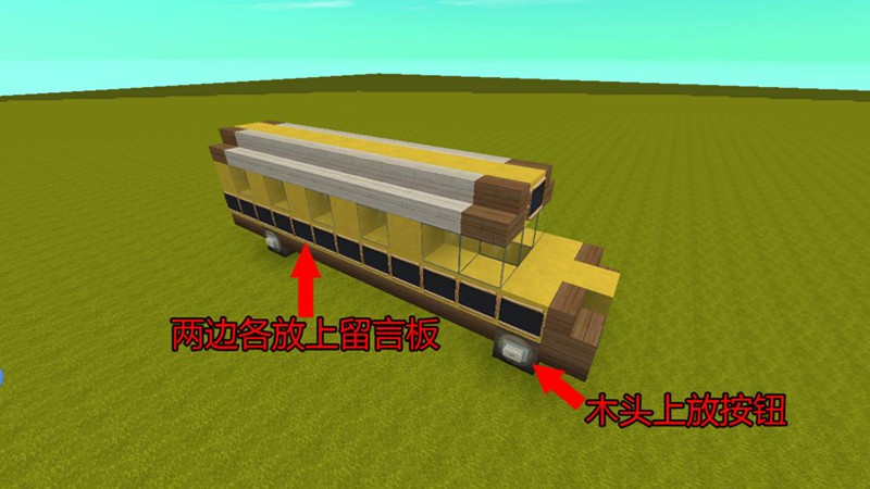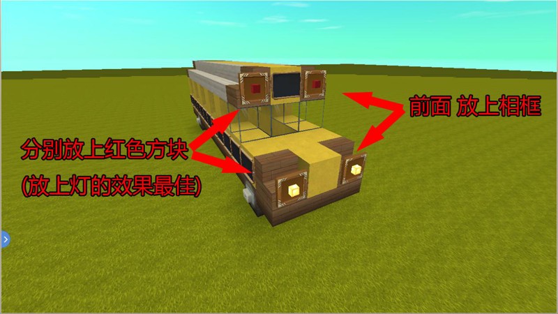 为了让校车更加逼真,可以在硬沙块两侧安装留言板作为装饰,同时在木头上放置按钮作为车灯。车前和车后分别放置相框和门,相框可以用来装饰车牌,门则是校车的出入口。最后在车顶的黄色硬沙块上每隔1格放置压板,这样一辆完整的迷你世界校车就建造完成了。