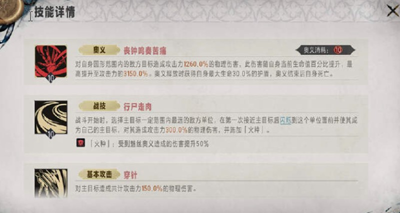 丧钟鸣奏苦痛是银与绯魅丝的主要输出技能,消耗30%生命值对主目标造成600%物理伤害,升级后伤害可提升至900%。行尸走肉会在战斗开始时自动选择主目标,并对三米范围内最远的敌人造成150%物理伤害,升级后伤害提升至225%。