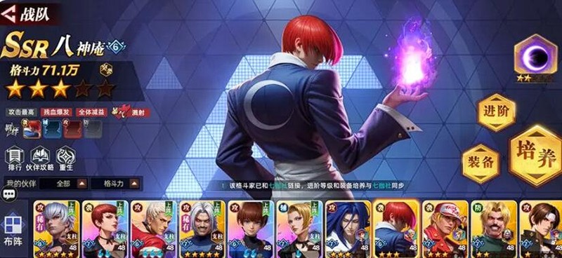 游戏的核心玩法围绕着角色收集与阵容搭配展开。通过心愿招募系统,玩家可以定向获取八神庵、草薙京等强力角色。这些经典格斗家之间还存在特殊羁绊效果,合理搭配可以显著提升队伍整体实力。比如八神庵与草薙京的组合就能产生强大的战斗协同。