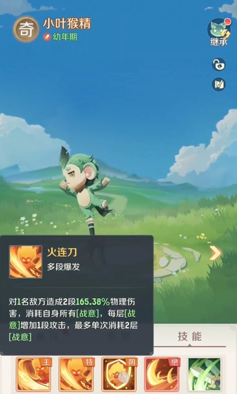 小叶猴精的战斗循环很简单,先用刀气叠加战意,再用火连刀消耗战意打出爆发。以上就是灵兽大冒险小叶猴精的使用攻略了,希望这篇攻略能帮助玩家更好地培养这只强力的输出型灵兽。