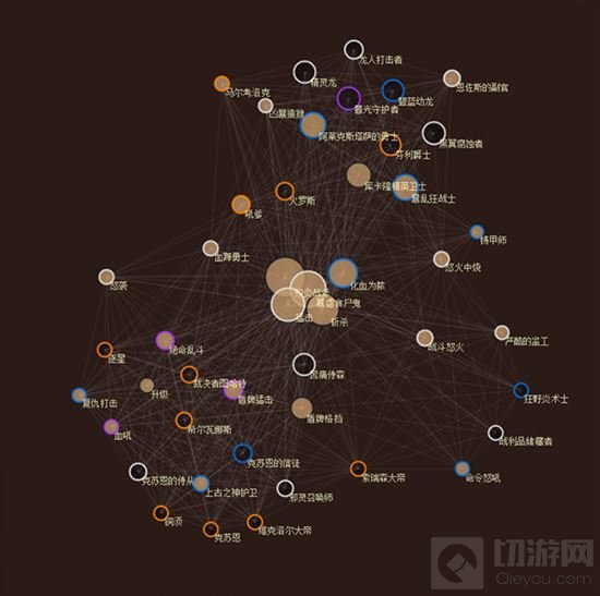 我们看到了什么?在图表的正中间是大多数卡组都会用到的职业卡,例如小斧子、猛击和斩杀等。但在图表的两侧,我们看到了两个不同的体系。第一个是控制战的体系,其中有很多慢速战士使用的卡牌。同时你也能看到的是,这个体系分为内外两层。内层包括了传统防战的核心卡(例如绝命乱斗和盾牌猛击等),它离图表的中心更加靠近一些,而外层是只有克战会带的一些卡。