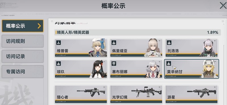 少女前线2追放的抽卡系统分为精英和标准两个品质等级。精英人形或武器的综合出货率为1.89%,这个概率包含了保底机制的影响。实际上精英品质的基础概率仅为0.6%,再细分为人形和武器的话,每项的具体概率约为0.3%。这意味着想要单抽获得精英品质的难度相当大。