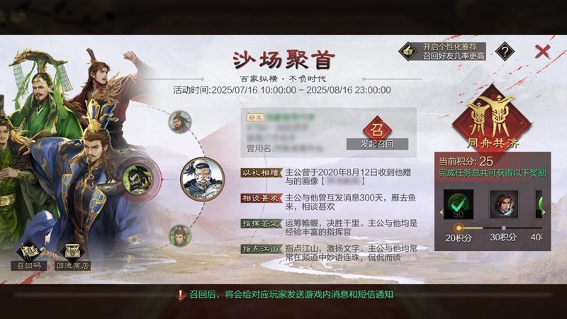 活动介绍:2025年6月16日10点前开启的S1服务器,征服赛季服务器,备战区将开启活动。2025年7月1日10点前创建的青春服角色且历史势力值≥2000,可在活动界面发出召回邀请或生成召回码分享给满足本次回归条件的主公。成功召回主公并达成一定条件可以获得虎符、画笺以及头像框奖励。经典服和青春服角色之间不能相互召回。