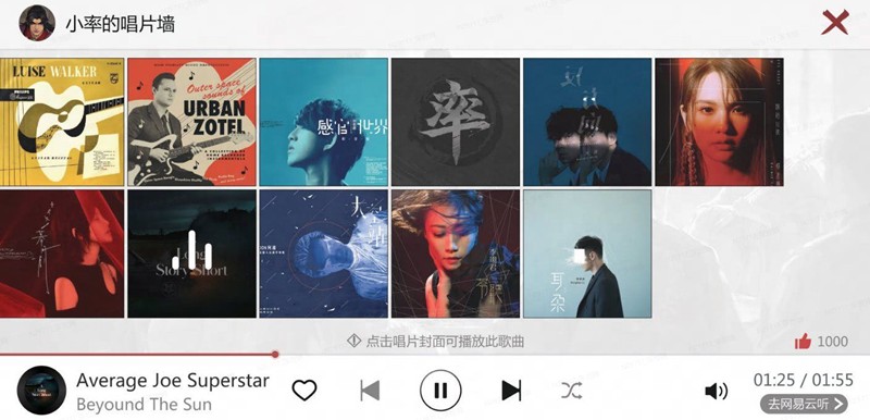 主公们授权登录自己的网易云音乐账号后,即可打造你的个性化主公簿唱片墙!自由组合你喜爱的歌曲封面,或直接一键生成由上月你在网易云音乐收听的TOP20歌曲封面组成的唱片墙(数据来源于网易云音乐“听歌足迹”),彰显你的音乐品味。