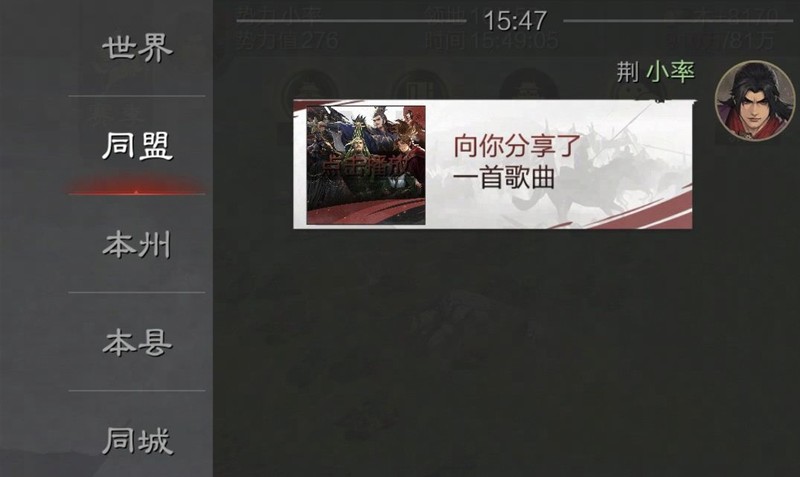 主公们除了能够自己听歌以外,还可以一键将歌曲分享至同盟/聚义频道、家族聊天以及个人聊天中,无论是鼓舞士气的战歌,还是抒发情怀的旋律,都能即时邀请好友共赏,用音乐连接彼此,共谱十三州情谊新篇章。