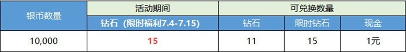 A:您好,活动期(7月4日-7月17日),银币兑换钻石比例提升至15,288,888银币可兑换433钻石(建议活动期内兑换)。