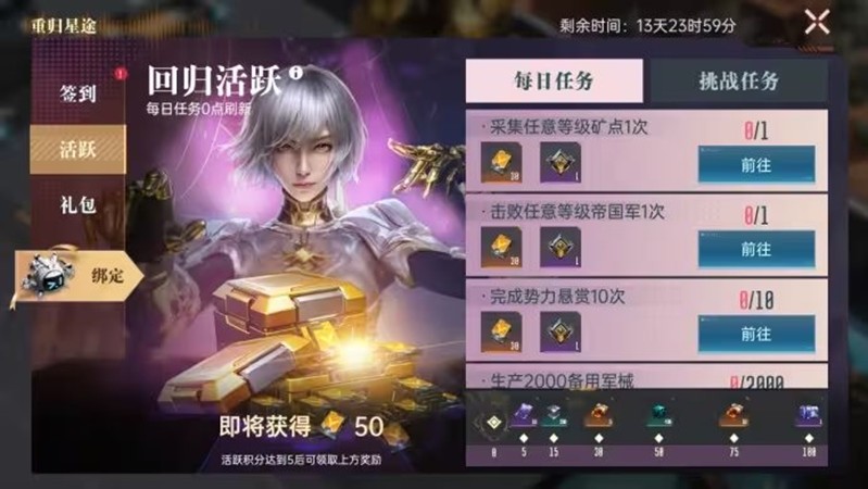 活跃任务分为每日任务与挑战任务,每日任务的内容每天0点会进行刷新,达成对应条件即可领取信用点与回归积分奖励。