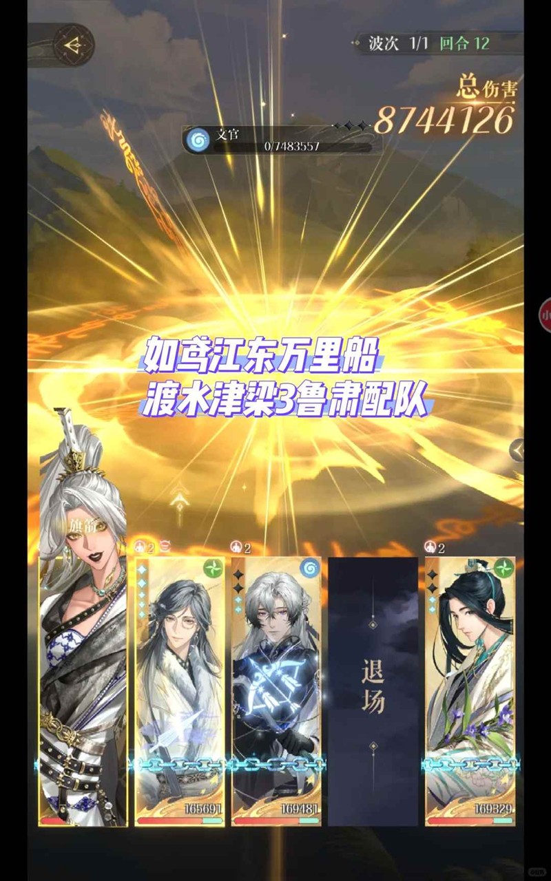 鲁肃大招阶段我方5号位的【文官】数量要比鲁肃头顶的【文官】数量多利用徐庶剑来+持续伤害【放猎逐禽】多打死文官,如果打死的文官数量没有超过鲁肃头顶文官数量则被全体劝退