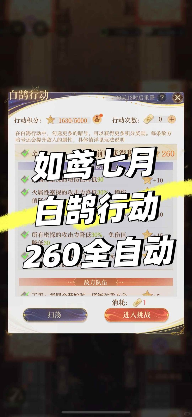 以上就是如鸢白鹄行动七月260星全自动攻略的全部内容了,更多游戏资讯,攻略内容敬请关注切游网,您的支持是我们努力的动力!