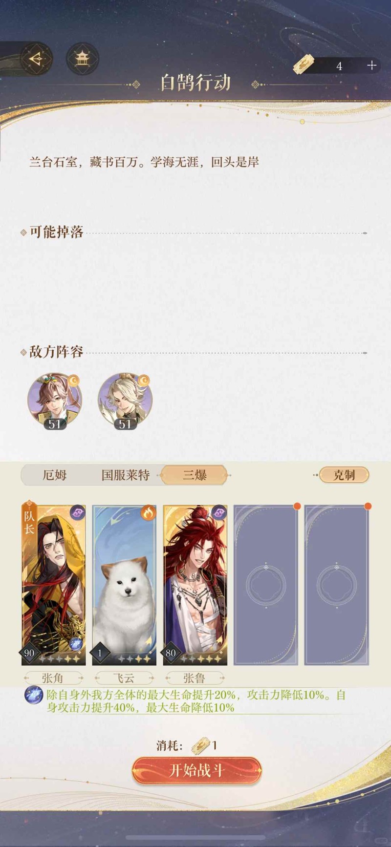 如鸢游戏以策略卡牌和沉浸式剧情为核心玩法,共有傅融、刘辩、袁基、左慈、孙策五位男主,玩家只需完成指定任务和剧情对话就能快速通关。那么如鸢游戏中白鹄行动260星应该怎么打呢?小编为你准备了一份攻略,一起来看看吧~