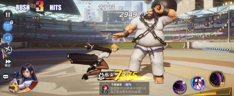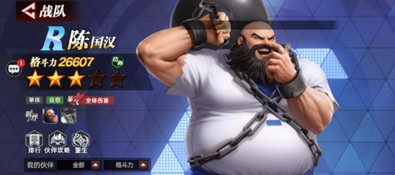 在队友受到轻拳攻击时,陈国汉能额外恢复50点怒气。他的必杀技是对单体目标造成物理伤害,同时提升自身5%防御。爆气状态下,必杀技还能额外获得5%生命值。怒气技能则能攻击单体并对全体造成冲击,有30%几率降低敌方5%命中率。
