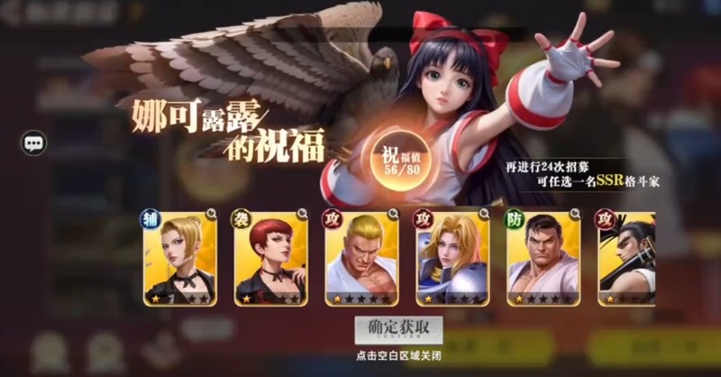 在全明星觉醒的标准招募卡池中,当玩家累计进行80次招募后,就会触发娜可露露的祝福效果。这个祝福允许玩家在特定页面中直接选择一名SSR格斗家加入阵容。目前可选的SSR角色包括橘右京、坂崎琢磨、夏洛特等热门角色,但大蛇这类稀有角色不在选择范围内。