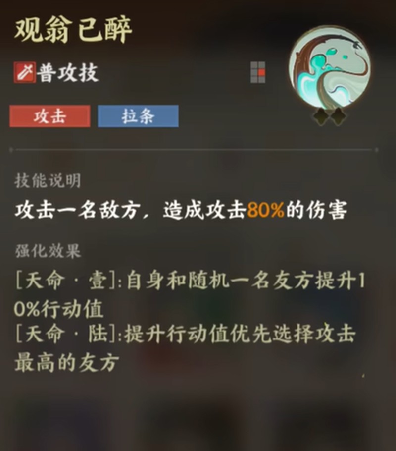 姜子牙的普攻技能"观翁已醉"看似简单,实则暗藏玄机。这个技能在造成80%攻击力伤害的同时,还能提升自身行动条并为随机一名队友增加10%行动值。这种双重增益效果让姜子牙在普通攻击时就能为团队创造战术优势。