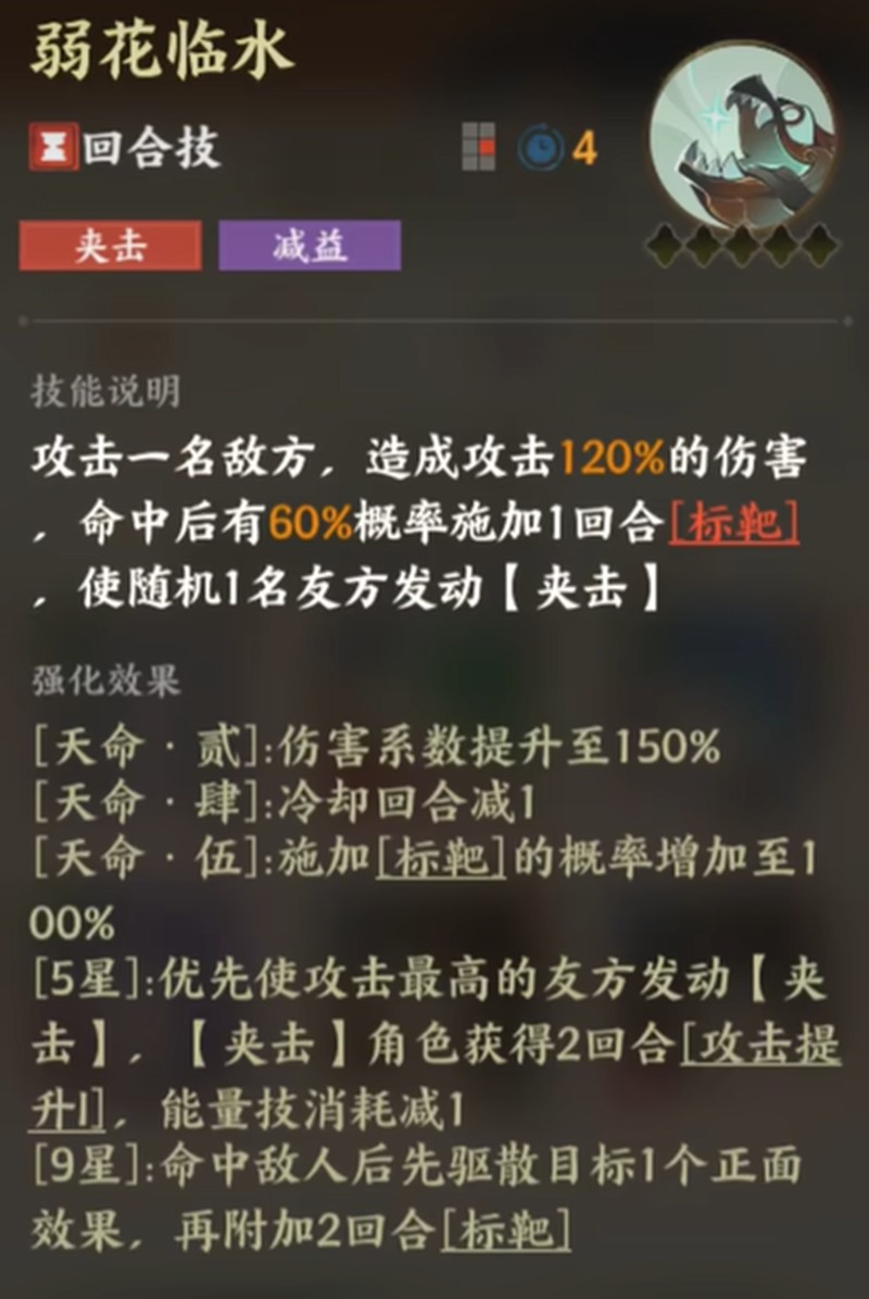 回合技"弱花临水"是姜子牙的核心输出手段之一。该技能最高可造成120%攻击伤害,并有60%概率给敌人附加"标靶"状态。当强化至"天命·伍"时,"标靶"附加概率提升至100%,确保技能效果稳定触发。5星突破后,该技能还能为攻击最高的队友提供2回合的"攻击提升I"效果。
