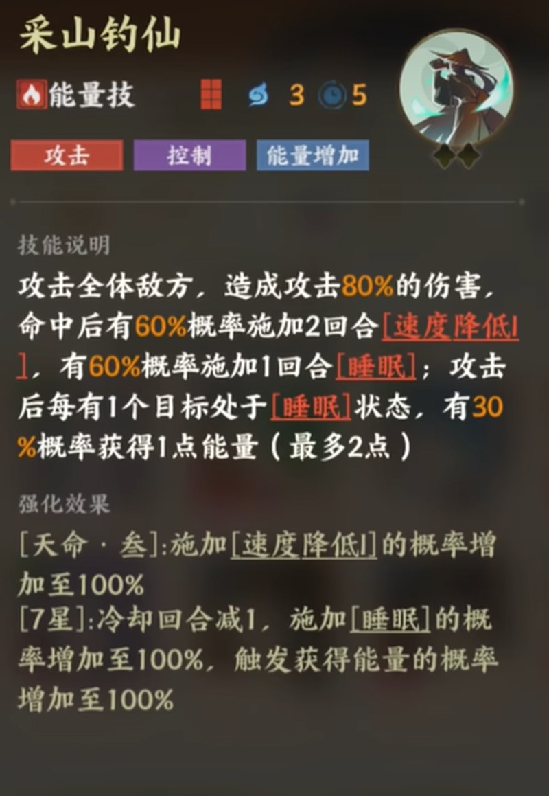 能量技"采山钓仙"展现了姜子牙强大的控场能力。这个群体技能可造成80%攻击伤害,并高概率附加"速度降低"和"睡眠"效果。7星突破后,技能冷却时间缩短,且负面状态附加概率提升至100%,使姜子牙成为名副其实的战场控制大师。