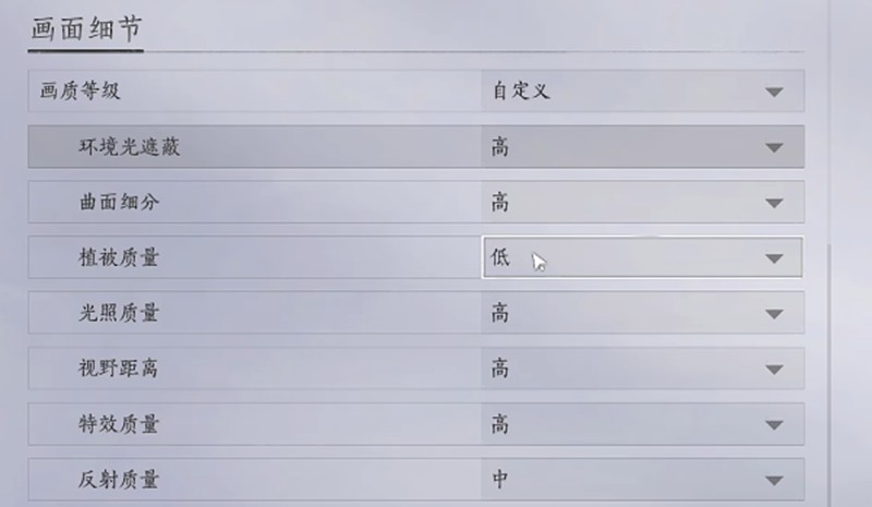 在画质细节设置方面,建议将环境光遮蔽、曲面细分、光照质量、视野距离和特效质量这几个选项都调到高。这些设置对游戏画面表现影响较大,RTX3060完全能够胜任。不过要注意将植被质量调低,反射质量调中,这两个选项比较消耗显卡资源,适当降低可以显著提升帧数。