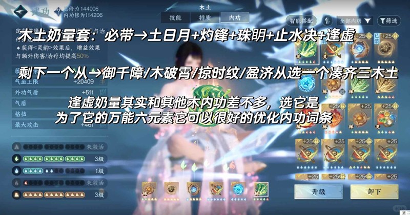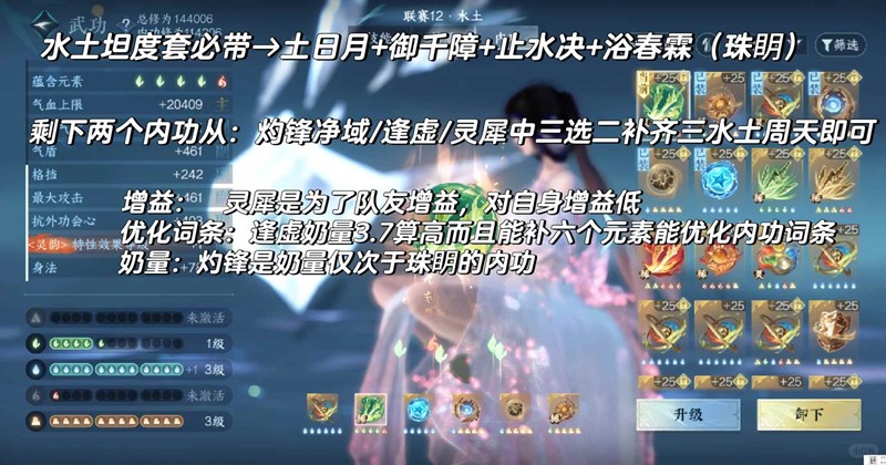 内功水土还有一个选择,带荡江斗触发土元素百分之6伤害减免,但是不出触发一木一金一火周天,且土元素要多一个(水元素多一个也行),但是难度大,这会导致内功词条暴毙,所以我不推荐
