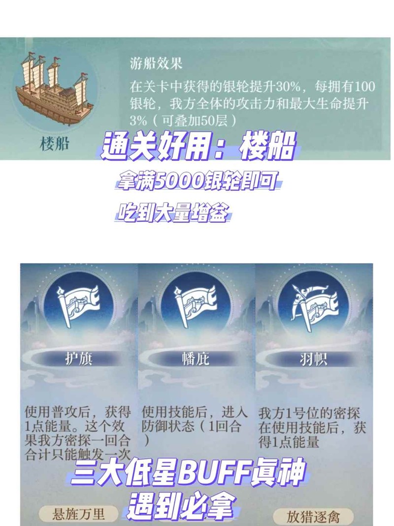 收集船歌拿奖励:幽灵船+渡水津梁一,开局两个BUFF都选要刷的,挑迷雾和漂流罐走,迷雾大于漂流罐大于战斗,迷雾出金色紫色BUFF以及塞一堆特定种类祝福的概率非常高,并且有可能遇到直接给你塞满全部祝福的事件