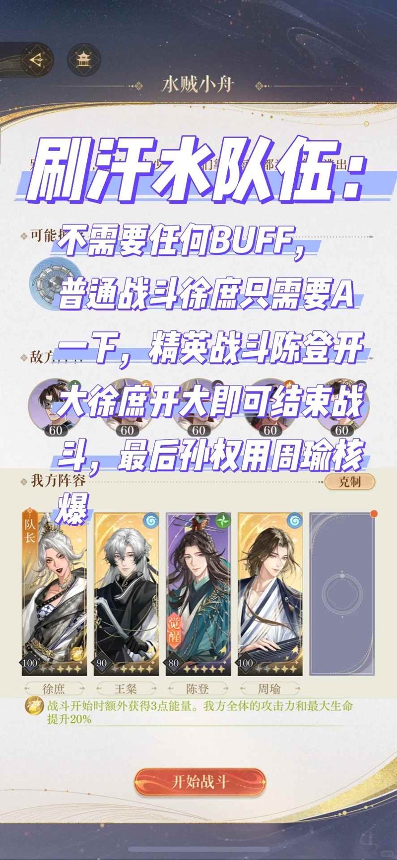 渡水津梁三鲁肃:鲁肃进入二阶段的时候会让我方攻击最高的角色退场,注意这里是局内攻击而非面板攻击,所以有可能出现徐庶的面板攻击小于张飞却退场的情况,只需要把徐庶的攻击星石卸下来几颗就可以,如果还是徐庶退场就是敌少盘或者带夏侯惇的原因,有敌多盘就换上,无敌多盘就把夏侯惇换掉。