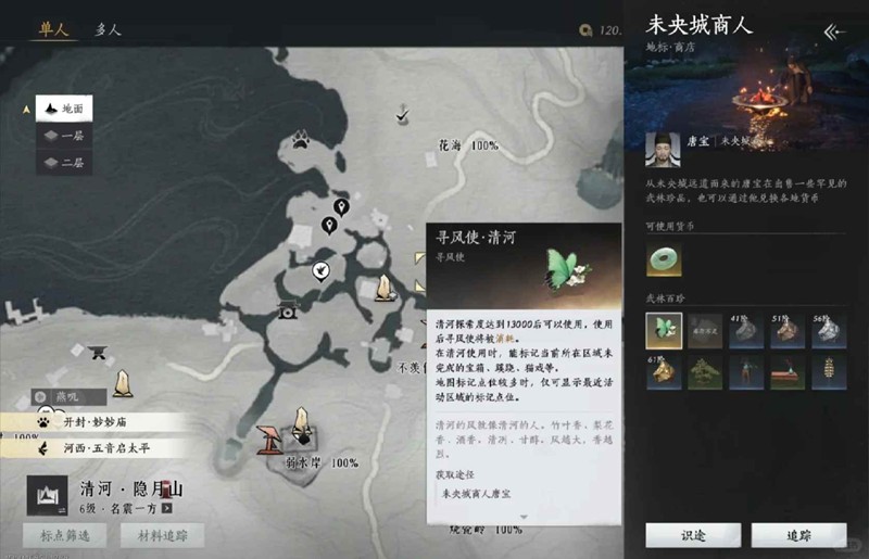 ③寻风使(寻风使需要注意的是清河探索度达到一万三,一个寻风使要50长鸣玉,而且有的可能检测不出来,所以慎用,如果地区宝箱只有10~20个,尽量跟着网上攻略走一遍来检查缺失宝箱)