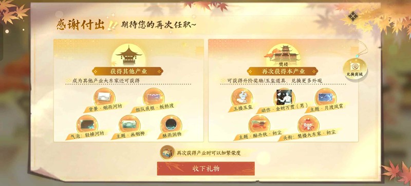 哦对了一期结束之后他会送你个盒子留到二期可以用,使用增加玉楼5000繁荣度,逆子也是很抠门了
