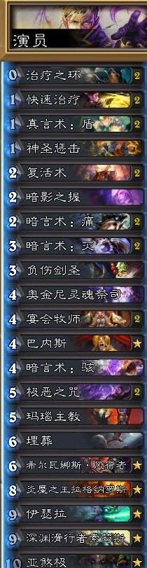 很多人都说这张卡是用来配合傻子的,这个用法可以,但是带傻子的牧师显然没有这套演员强(不管是上面哪套),所以能想到的新卡最大配合是巴内斯+大哥+沉默恢复身材。那么问题来了,如果抓不到巴内斯呢?可以看到卡组随从大部分都是依赖特效的,沉默自己随从过一张牌?很亏啊,而且如果自己没有随从战场呢?又不能像盾一样给对手加,所以我宁愿带盾而不带他。也许等他出了我会换一张盾试试,但可能很不好用。