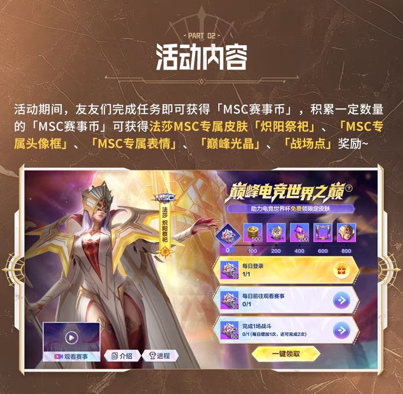 具体来说,玩家在游戏端内完成相关赛事任务后,即可获得包括巅峰光晶、MSC赛事头像框、MSC表情包以及限定史诗皮肤「法莎·炽阳祭祀」在内的独家奖励。这不仅为玩家提供了丰富的游戏体验,还带来了极具收藏价值的限定内容。