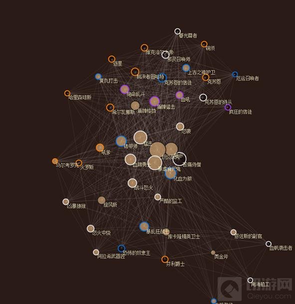 我们看到了什么?在图表的正中间是大多数卡组都会用到的职业卡,例如小斧子、猛击和斩杀等。但在图表的两侧,我们看到了两个不同的体系。第一个是控制战的体系,其中有很多慢速战士使用的卡牌。同时你也能看到的是,这个体系分为内外两层。内层包括了传统防战的核心卡(例如绝命乱斗和盾牌猛击等),它离图表的中心更加靠近一些,而外层是只有克战会带的一些卡。