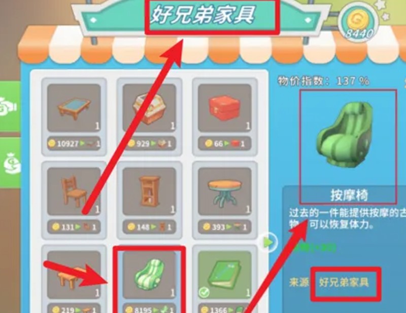 按摩椅可以在游戏中的好兄弟家具店直接购买,售价为8195金币。虽然价格不菲,但这个家具的实用价值完全值得投资。在波西亚时光手游中,体力是进行各种活动的重要资源,采矿、伐木、战斗等都会消耗体力,而按摩椅提供的体力恢复效果能大大提升游戏体验。