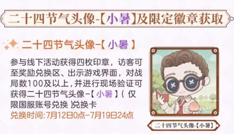 参与现场活动,各位访客有机会获得二十四节气头像-【小暑】兑换卡、线下限量徽章【小暑】、线下活动限定明信片、第五人格周边等丰富奖励~